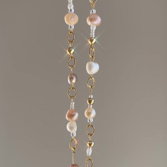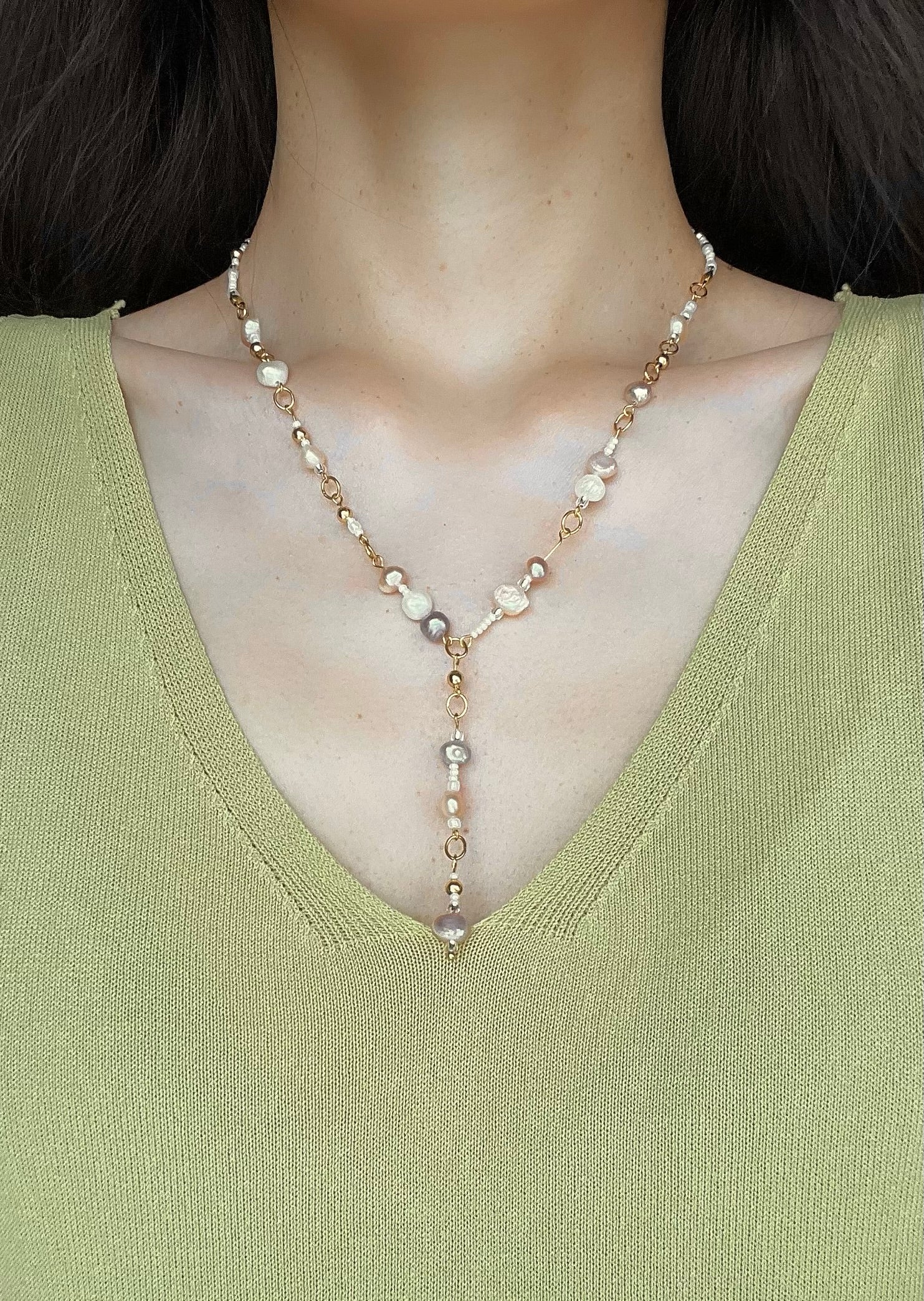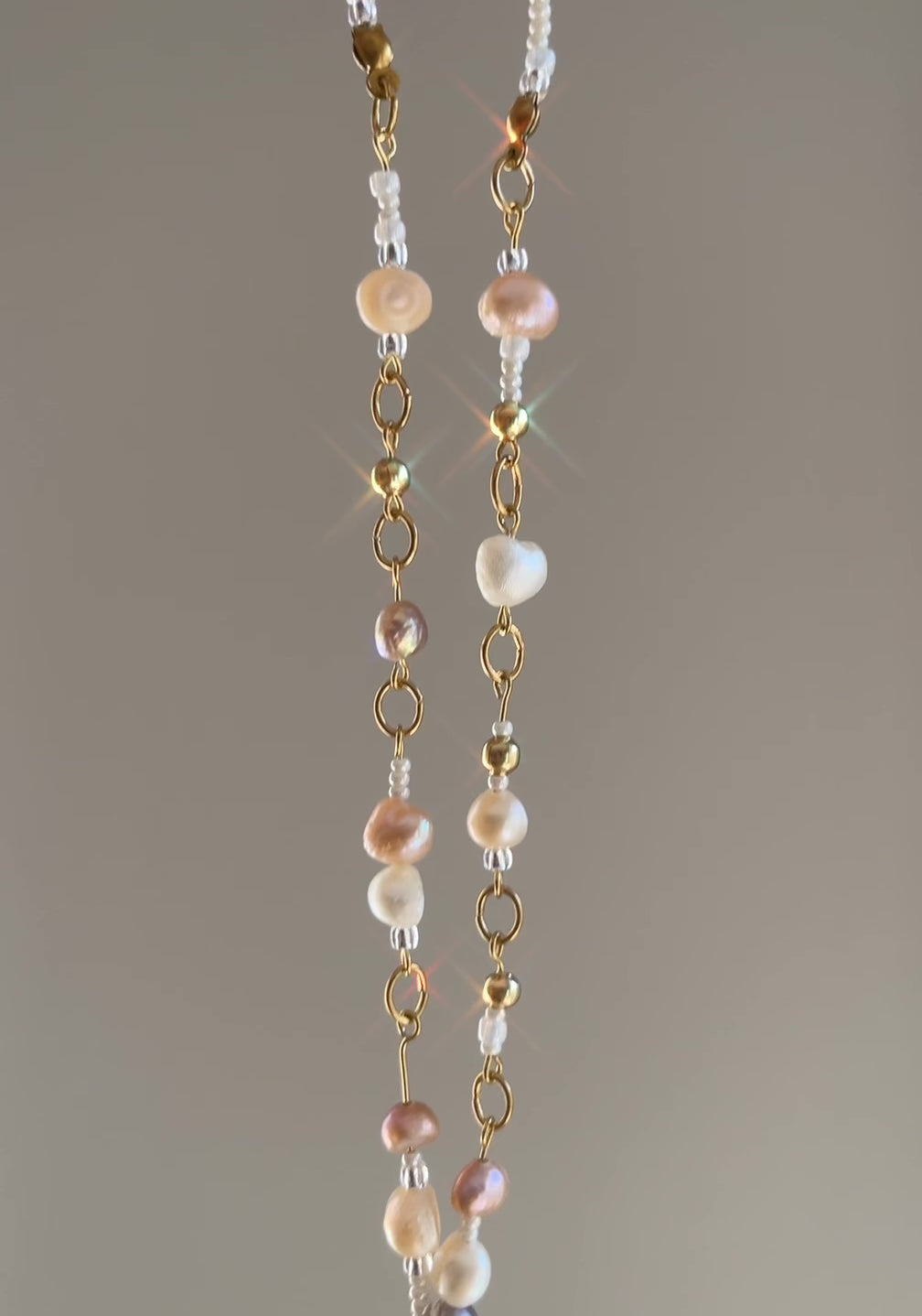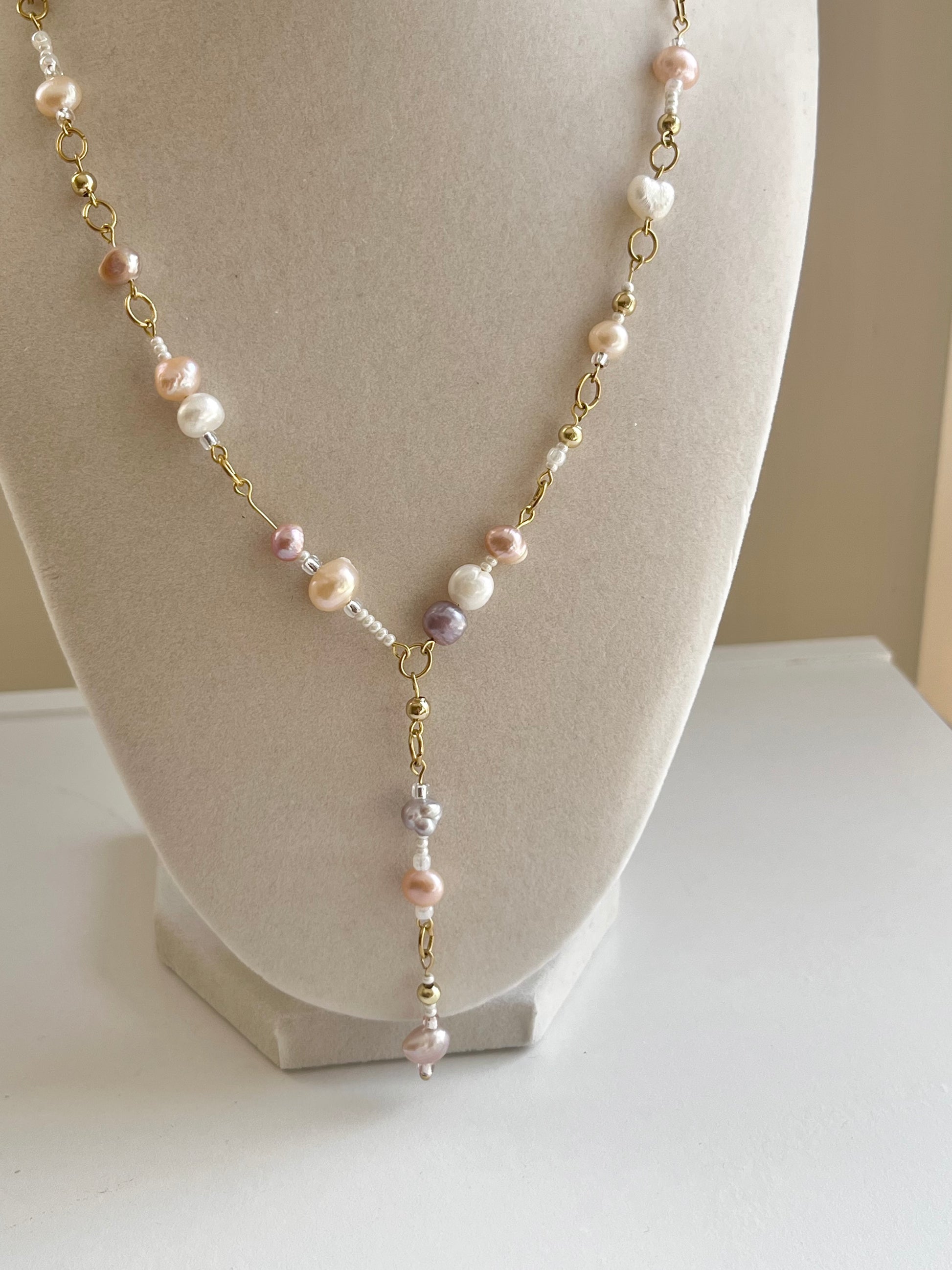 A delicate strand of luminous freshwater pearls, Japanese & Czech glass beads, and vintage-inspired gold-tone links, this necklace tells a story of softness and strength. Each bead is hand-wired with care into a Y-shape drop that elongates the neckline and glimmers like a quiet sunrise over the ocean.