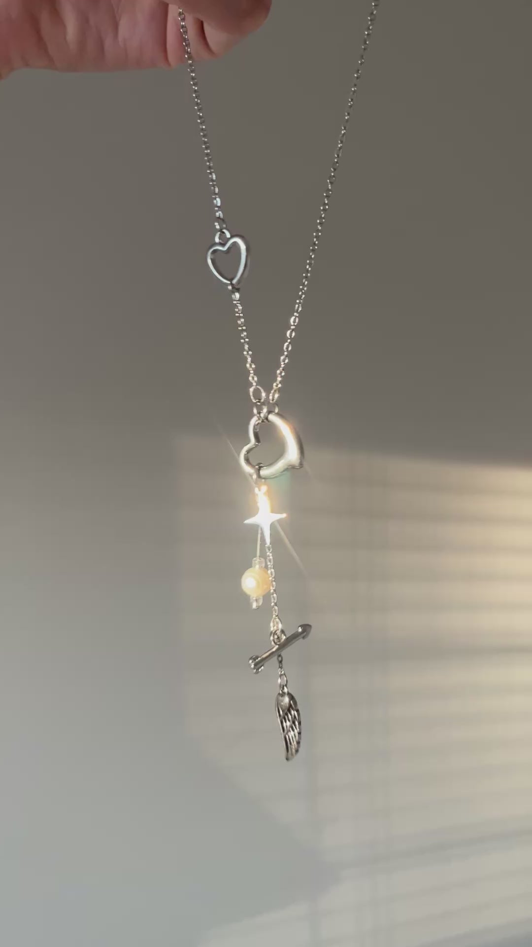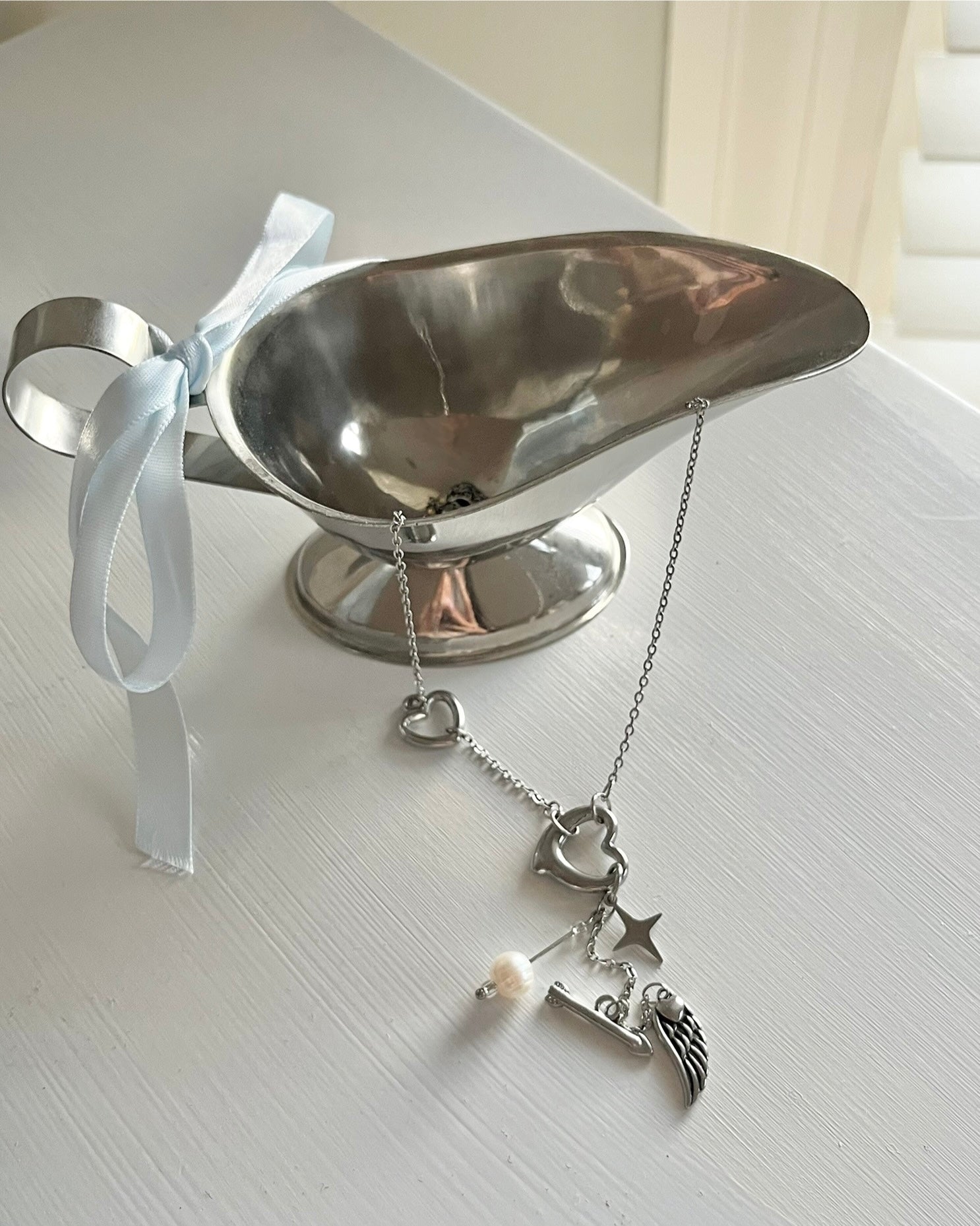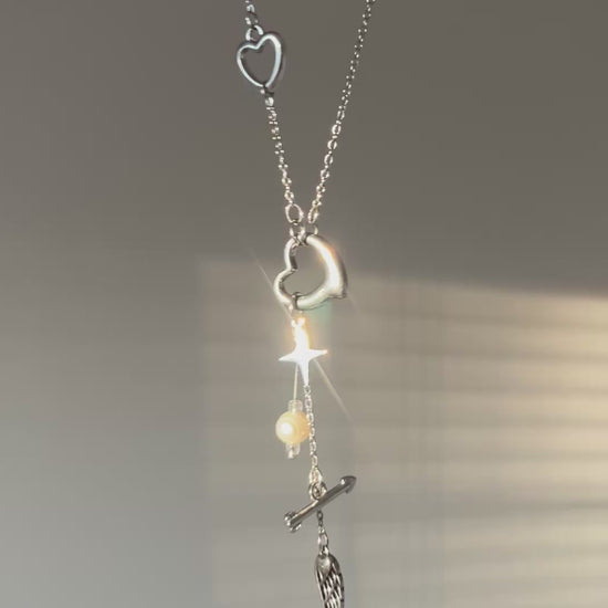 This asymmetrical silver-tone steel necklace features offset hearts and a cascade of symbolic charms ˚₊· 𓆩♡𓆪 ➵ ‧₊˚